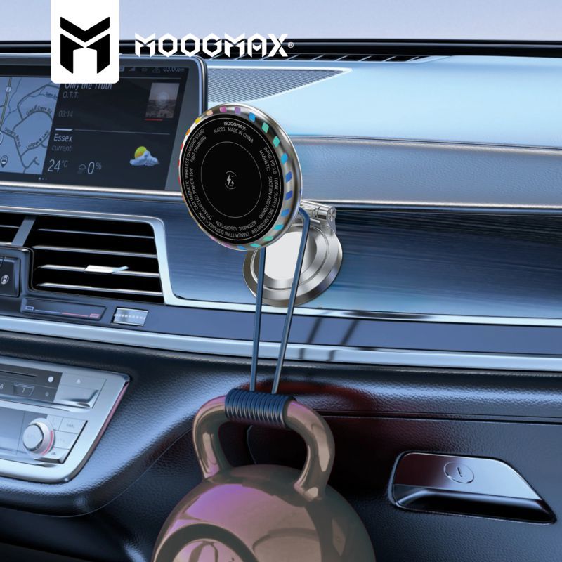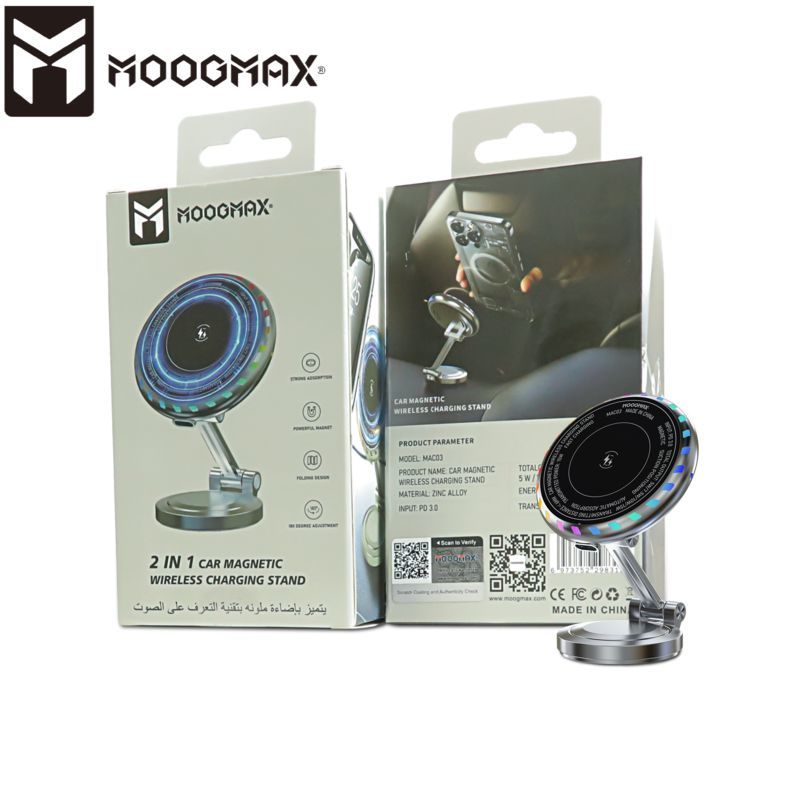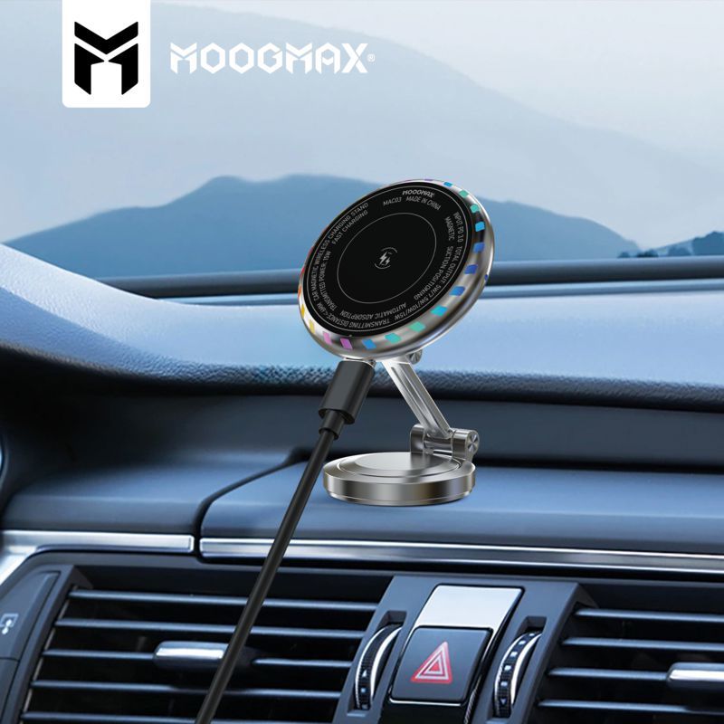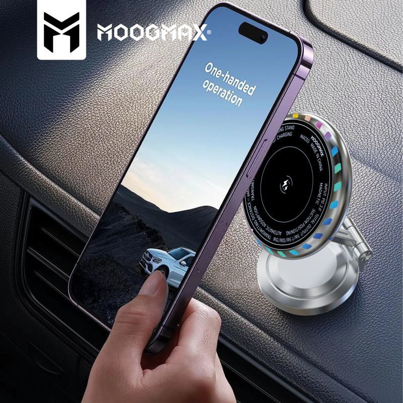 استمتع براحة غير مسبوقة مع حامل الشحن اللاسلكي المغناطيسي للسيارة من موغ ماكس 2 في 1. يتميز بشحن سريع وآمن، وقبضة مغناطيسية قوية متوافقة مع MagSafe، وهيكل أنيق من سبائك الزنك، وقاعدة قابلة للتعديل بالكامل. حافظ على هاتفك أمامك ومشحونًا أثناء القيادة، مع لمسة إضاءة RGB عصرية.